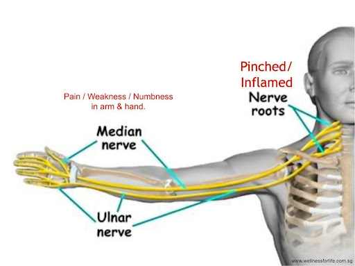 Czasami dochodzi do ucisku na nerw w 2 różnych okolicach (tzw. double crush syndrome) jak jest to pokazane na ilustracji, gdzie mamy uciśnięte korzenie nerwów ręki przez dyski w okolicy szyi lub przez mięśnie pochyłe, żebro szyjne, czy mięsień piersiowy mniejszy. Drugi ucisk może być pod ścięgnem bicepsa, w okolicy łokcia lub w nadgarstku. Doświadczony fizjoterapeuta jest w stanie ustalić miejsce kompresji. Może to być później potwierdzone badaniami obrazowymi takimi jak ultradźwięki lub MRI.