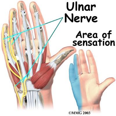 Ilustracja pokazuje przebieg nerwu łokciowego w nadgarstku, dłoni i palcach oraz dystrybucję bólu i drętwienia. Nerw ten najczęściej jest uciśnięty w nadgarstku albo w rowku łokcia, co widać na ilustracji po lewej stronie.