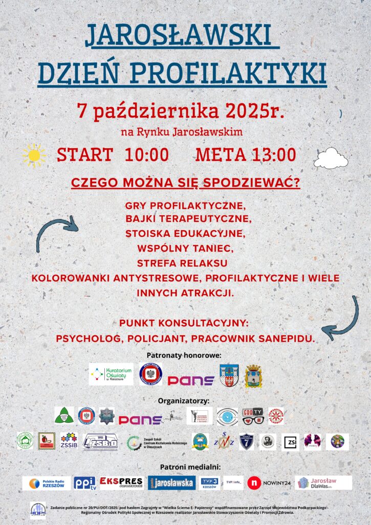 Już 7 października br., w godzinach od 10:00 do 13:00, Rynek w Jarosławiu zamieni się w przestrzeń edukacji, zabawy i wsparcia – wszystko za sprawą Jarosławskiego Dnia Profilaktyki. To wydarzenie skierowane do całych rodzin, którego celem jest promocja zdrowego stylu życia, profilaktyki uzależnień, dbania o zdrowie psychiczne i budowania bezpiecznego otoczenia.