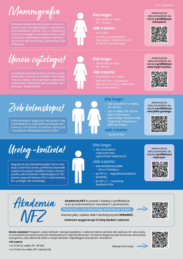Kalendarz przypomina o kluczowych badaniach profilaktycznych dla kobiet i mężczyzn, takich jak mammografia, cytologia, kolonoskopia czy badania urologiczne. W czytelny sposób pokazuje, dla kogo są przeznaczone poszczególne badania i jak często należy je wykonywać, zgodnie z aktualnymi zaleceniami.